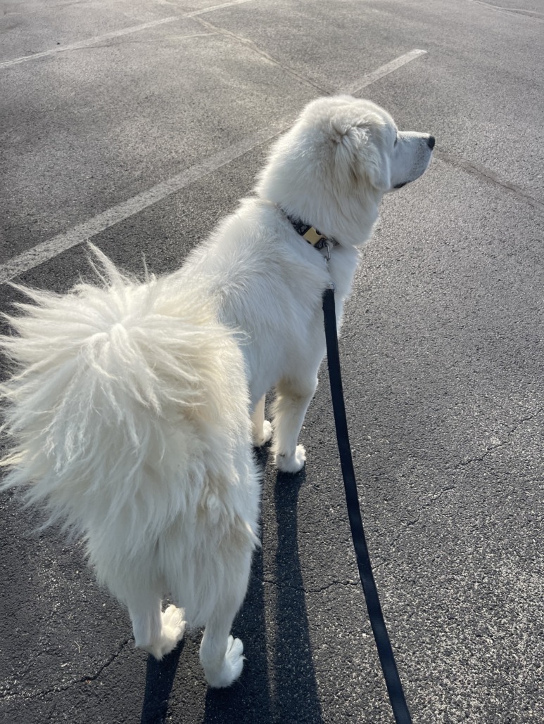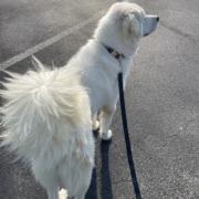 A large, white Great Pyrenees male. Wearing a black and white Aztec print collar with metal buckle. Knows the sit command and is dog friendly. He is currently at the bed and biscuit kennel in Westfield. They have a Great Pyrenees rescue there. They will require proof of ownership. Hope he finds his home soon!