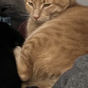 Medium sized domestic shorthair. Orange tabby, golden eyes.