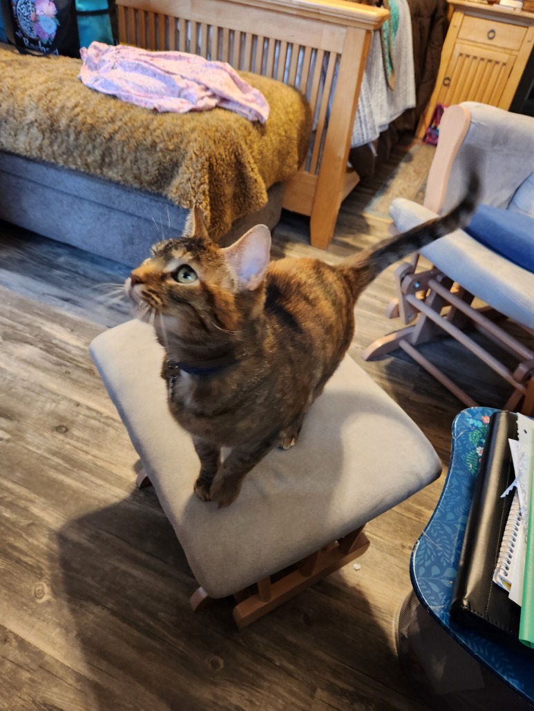 Zoe answers to cat. Very sweet. No collar we had not had time to replace it but she is chipped. She is a Torby.