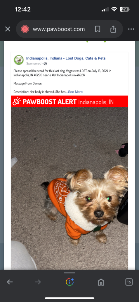 Lost Dog, Alert #75038 Vegas missing near 41st and Leslie, Indianapolis Eastside 42nd Arlington46226