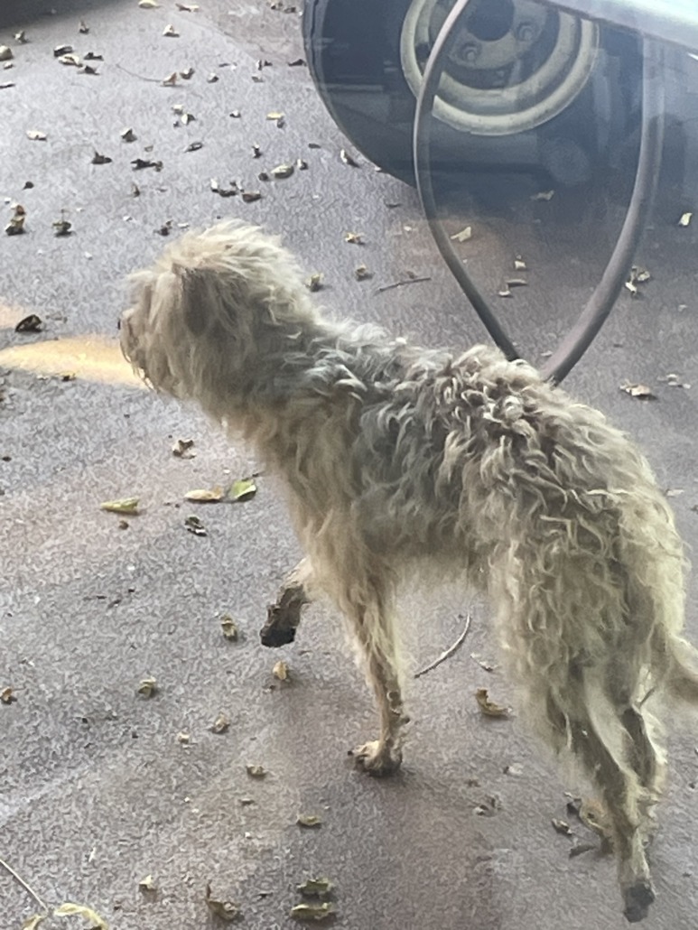 Looks skinny, lost, hungry, started to eat some food and then got scared off and ran across street, it was on Marion county side when it ran it went across the street into Hancock County side