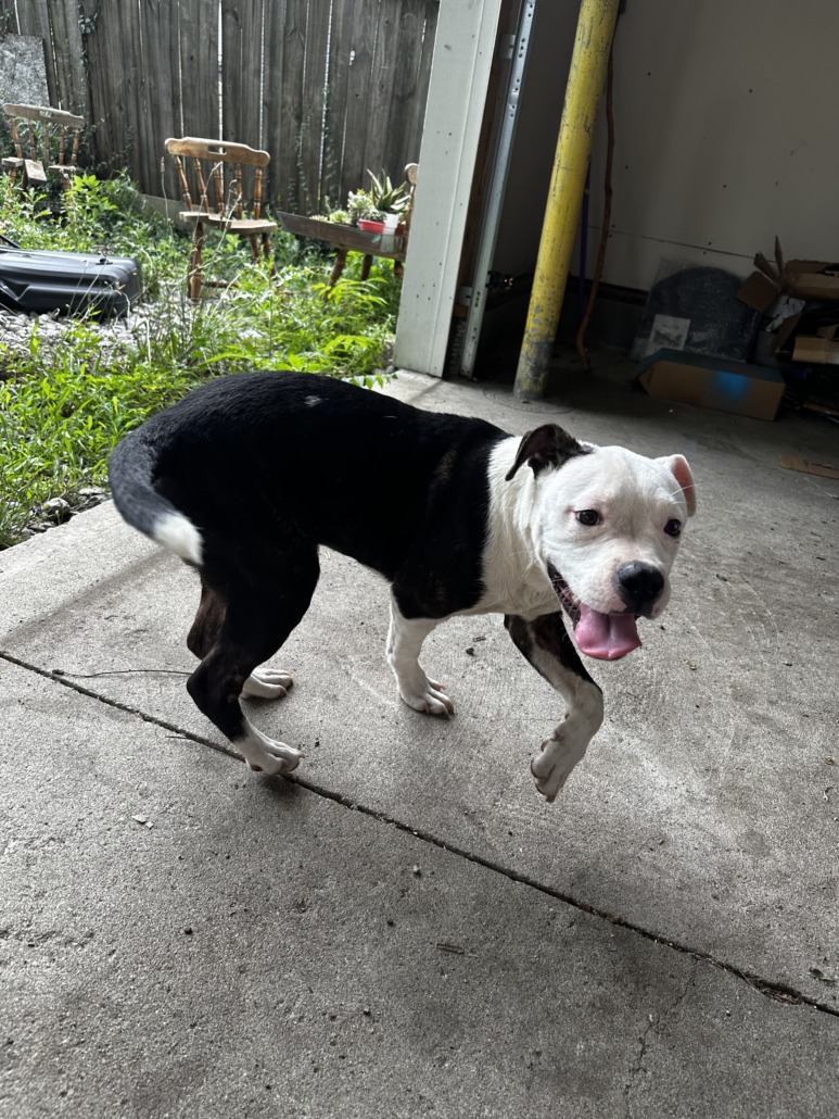 Very sweet boy, he is not neutered and has no collar or tag. He seems to be a pitbull mix, and he smells like a puppy though I don’t know his real age.
