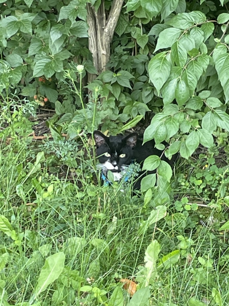 Black and white tuxedo cat with blue collar. Hanging out in my backyard. Looks like it had a tag at one point, but it has fallen off.