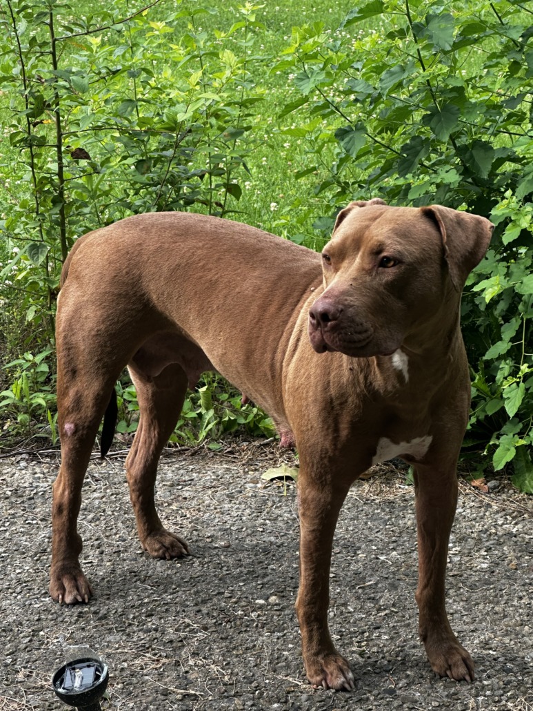 Female large pitbull mix looks like she recently had puppies very scratched up as ticks, scared and hungry, but very friendly once she earned my trust