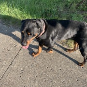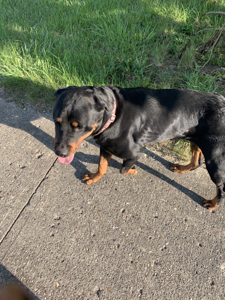 Rot with purple collar pink polka dots. Friendly