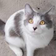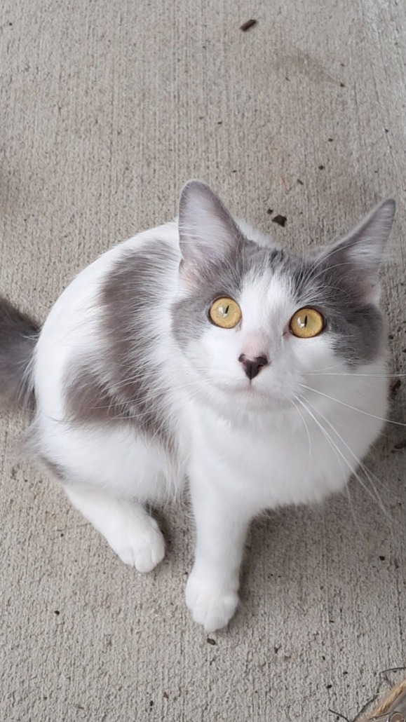 She is a long haired cat mostly white for with splotches of gray. She’s a furry girl, and has a black heart nose❤️. She’s probably around 8lbs. She’s about 10 months old, very skiddish with new places and people. But she’s very vocal and sweet.