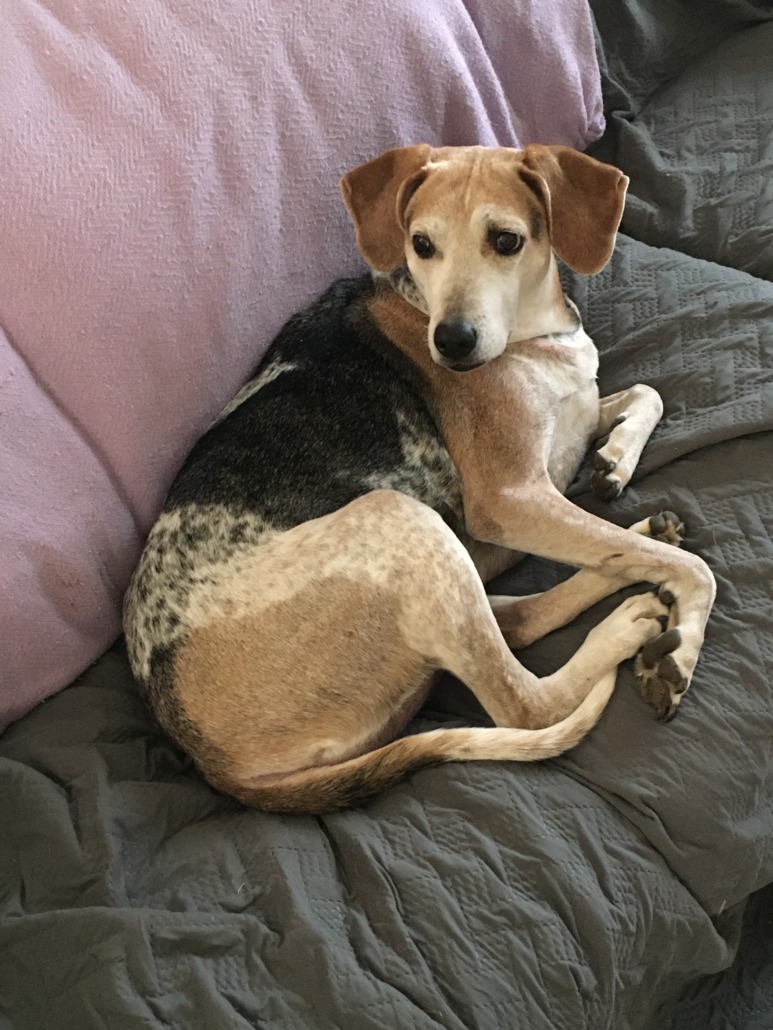 Tri-colored beagle coonhound mix. Approximately 50 pounds. Has lime green color and red harness and blue leash. She responds best to Fin. Very friendly.