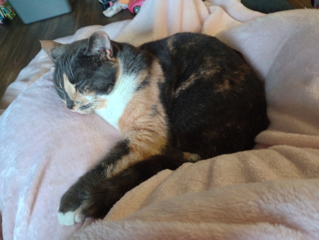 Emma is a little over a year old, calico kitty. She is an indoor kitty and has never really been outside. She’s very sweet and playful. She has a white patch across her chest. She is grey, orange, and white.
