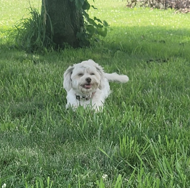 Pixie is a mostly white maltipoo. She has a little gray on her ears.