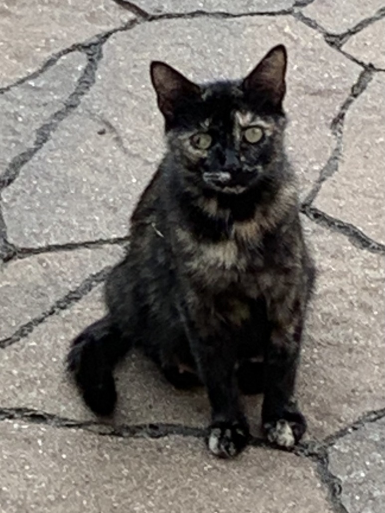 Cat appeared on our patio four days ago. She is a female. Super friendly, wants to be petted, sleeps on our patio furniture and is very keen on getting into the house. Obviously, a stray. Proof of ownership required.