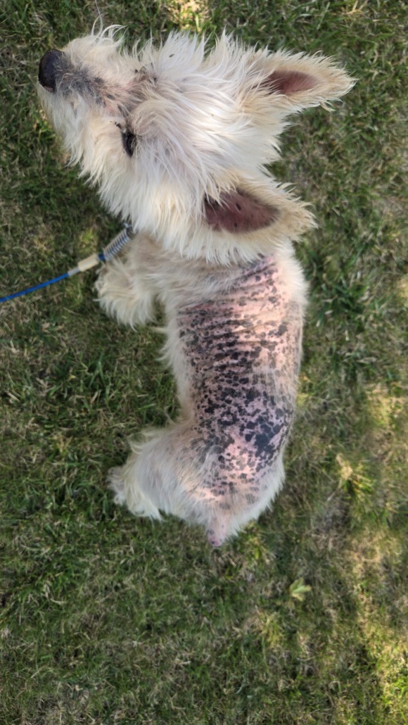 White dog, spots on his back, little fur. He got sunburned today. Green collar. Proof of ownership required. Picture of you with dog will suffice.
