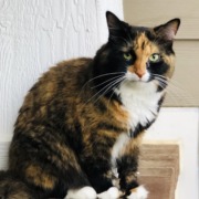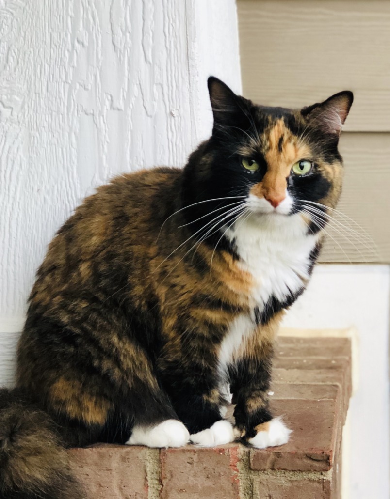 Medium hair calico with white paws and white patch on chest. Declawed in front.
