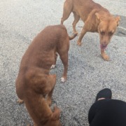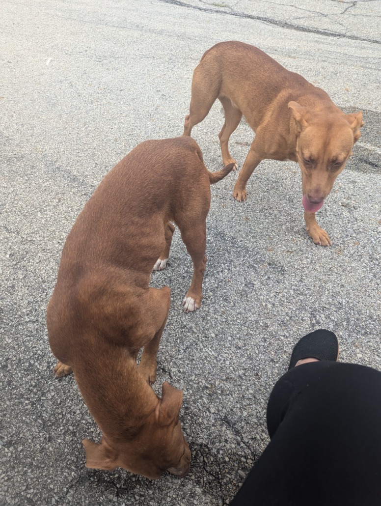 Two female dogs (seem to be sisters). Very bonded. No collars or tags. Appear to be intact and one may be in heat.