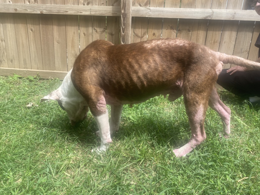 Buck is 66 pounds, malnourished and very sweet. He has a very serious skin condition possibly caused from flea infestation and a natural born skin disease. He is brindle brown and white and about 2 feet tall.
