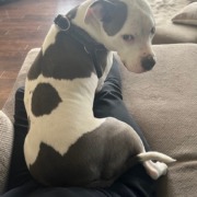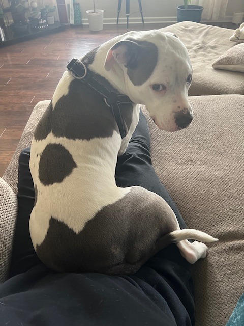 Pit bull mix. White with gray spots. Very friendly but will jump and lick.