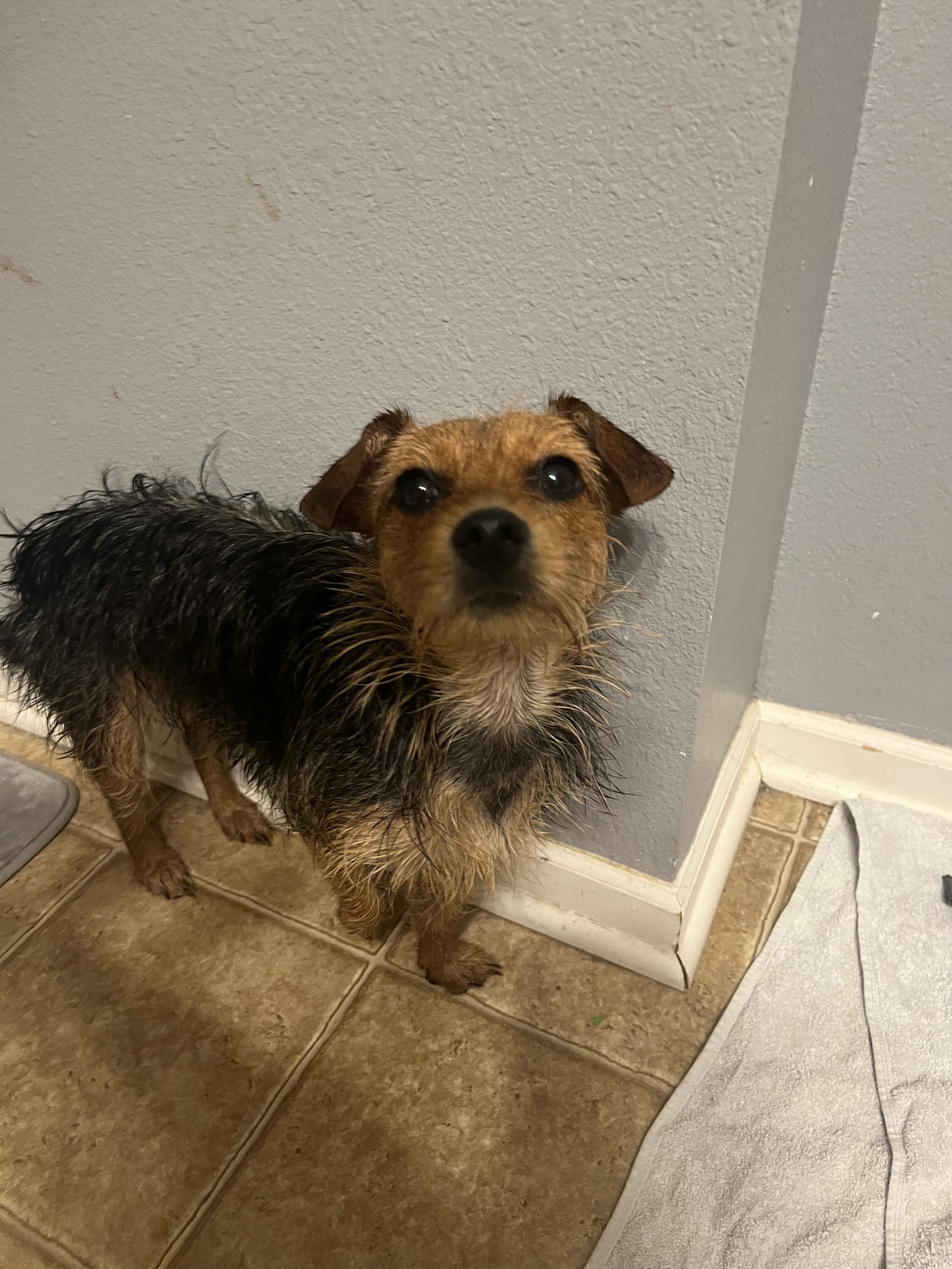 Brown and black wirey yorkie looking mix. Very sweet and playful. Proof of ownership is required.