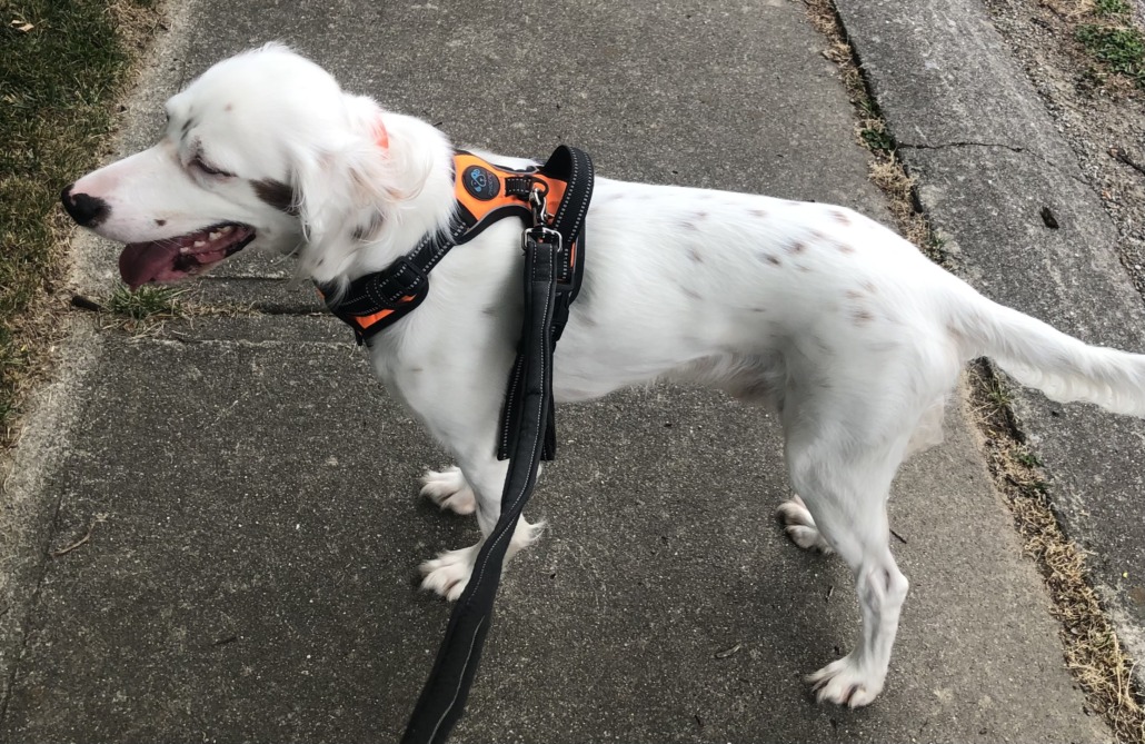 Mostly white with some brown spots male English Setter; high energy. Has vet tags on collar, has additional training collar.