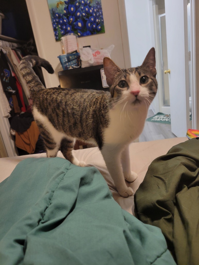 The cat we found a few days ago sometime during the night/morning managed to tear through our screen window and jump from our second story. We had the window cracked because it’s hot in that room. I’ve walked all around the neighborhood, I don’t see any sign of him. If anyone sees him he is incredibly people friendly and will probably come right to you, that’s what he did for us.