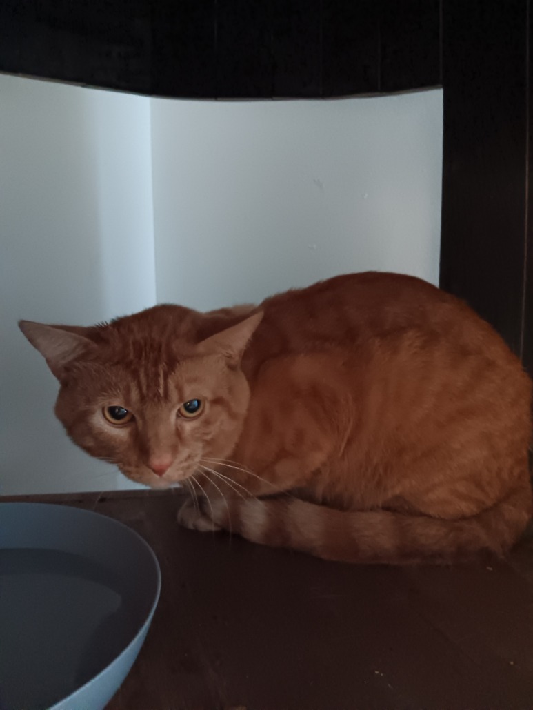 Orange friendly cat found under car. Was in a harness. If you can’t tell me what type of harness that would be great to prove ownership.