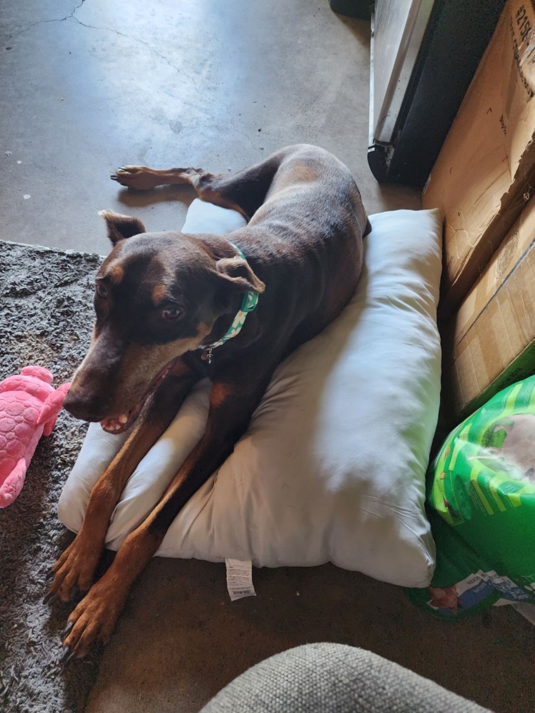 Older female Doberman, possible mix breed. She was found at W. Morris & High School Rd. the morning of August 6th around 9 a.m. She’s had puppies at some point and has several tumors and skin tags. She is probably between 6-8 years old. Proof of ownership is required to claim her.