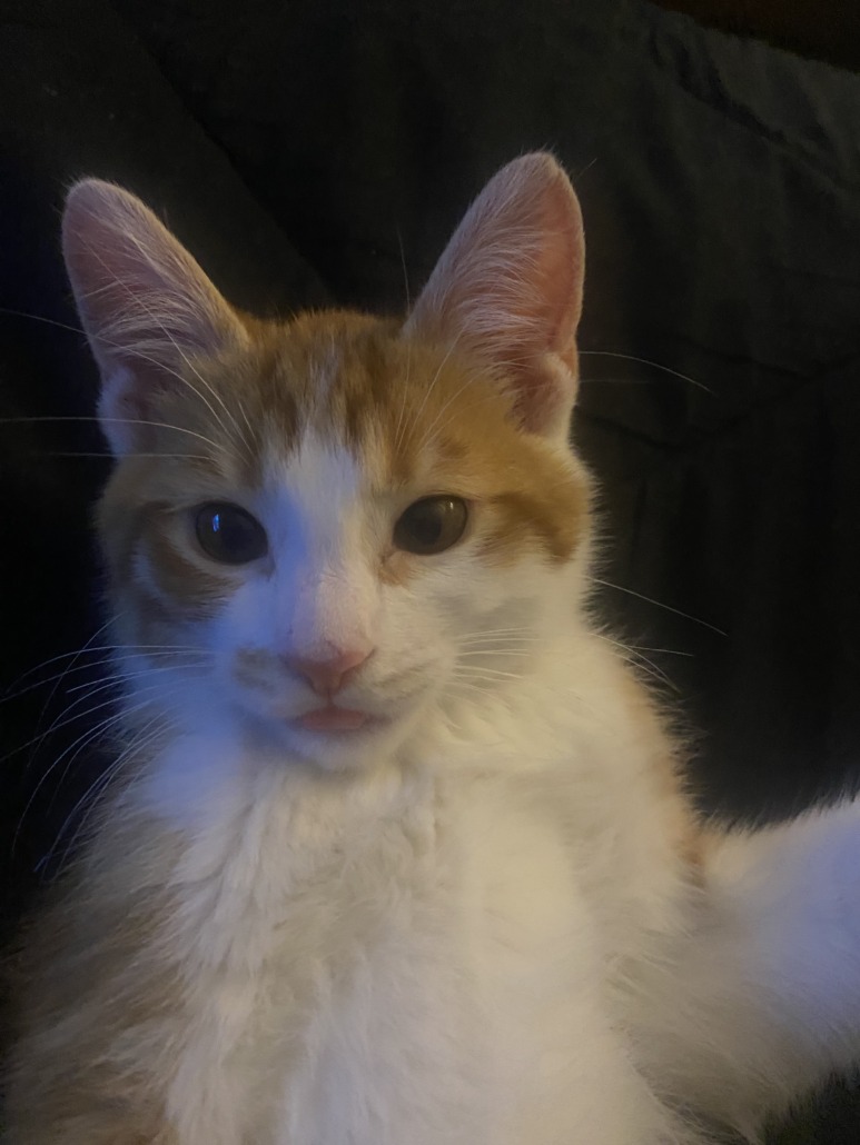 13 week old medium hair kitten, not neutered. Orange and black with striped tail.