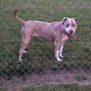 Sweet pit bull with pink collar, has a tracking tag that says Pet Nav. Found in community heights neighborhood
