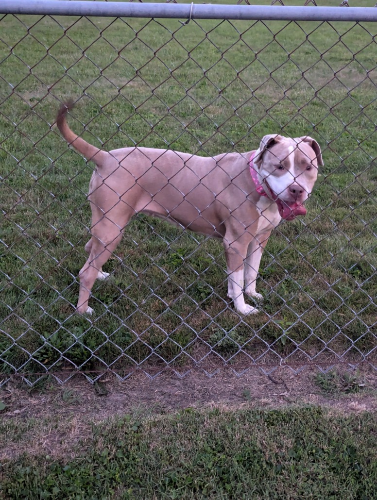 Sweet pit bull with pink collar, has a tracking tag that says Pet Nav. Found in community heights neighborhood