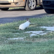 White bunny with brown face. Very clearly not a wild rabbit. Too skittish to catch.