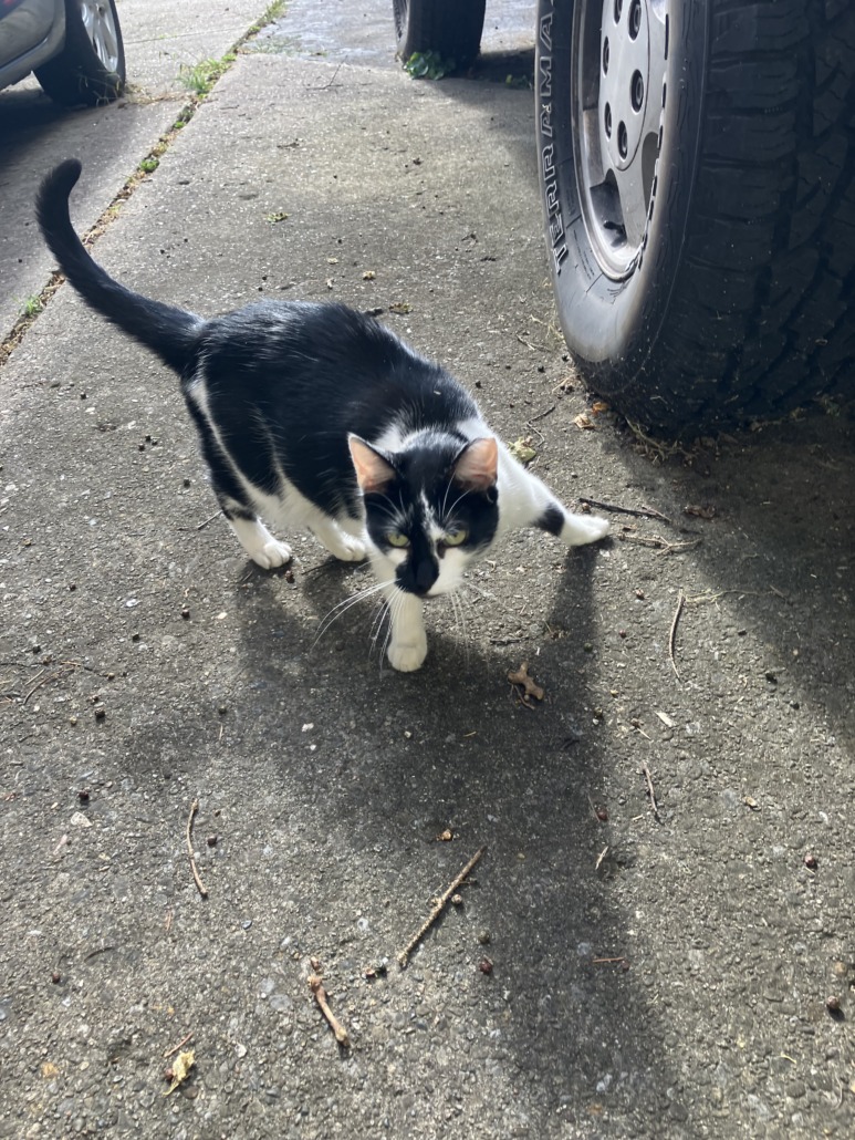 Tuxedo cat with left ear tip removed and green eyes. Walked with a slight limp when first sighted and hind legs seem weak.