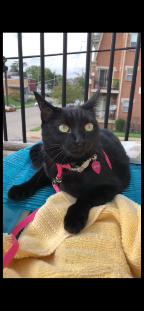 Black cat with green eyes. Has a silver sparkle collar with a heart shaped tag with her name on it.