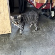 Young (probably around 9 months old) male tabby. Shy at first, but very friendly once he was fed. Has been sighted around our house for a week or two.