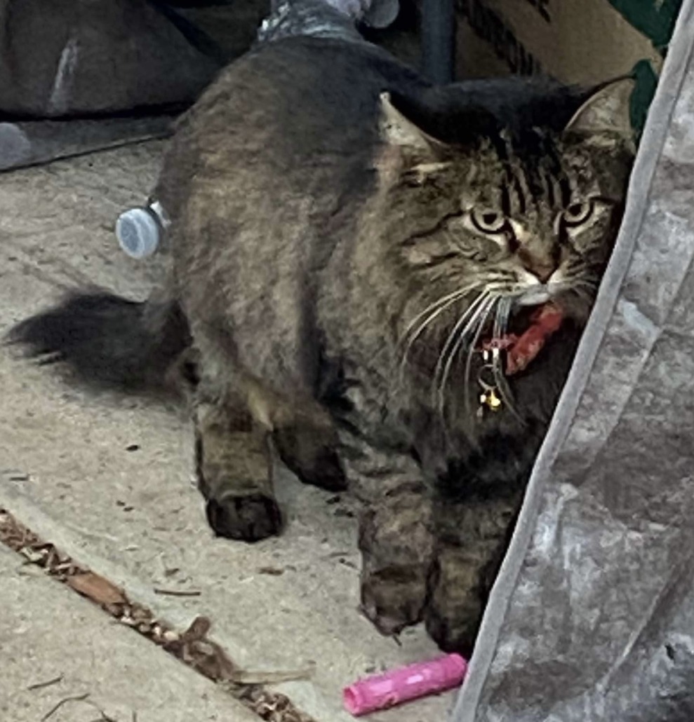Her right ear is clipped, she is spayed and had sparkly pink claw caps on. She doesn’t have a collar on. She is microchipped