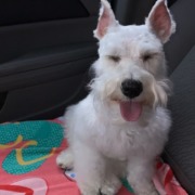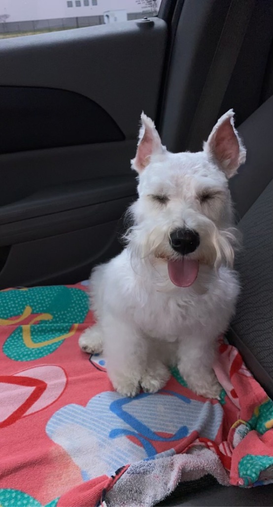 White miniature schnauzer. Wearing flea collar. Super sweet.