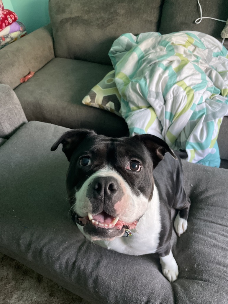 Princess is a black and white bulldog mix