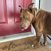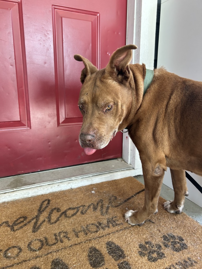Male, neutered. Looks older. Teal/green collar. Seems well fed. Has a chip but it isn’t registered. Good boy