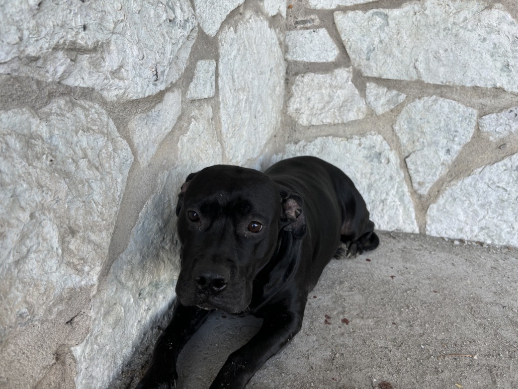 A black lab mix is injured blood coming from paws. Didn’t run away, but seemed scared. Could pet, but tensed up. Could not pick up