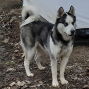 Black and white husky, very puffy cuevy white tail. Blue eyes. could be walking with a brown big dog