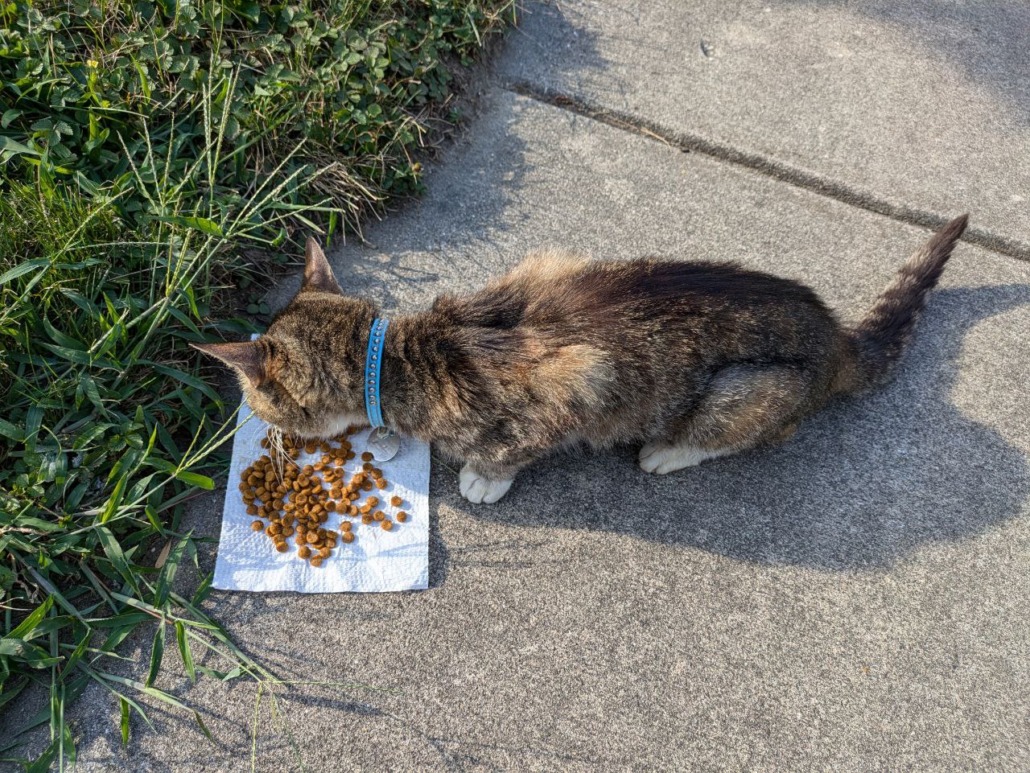 She is very affectionate and curious. When I found her, she was sitting on the sidewalk, and she came right up to me, meowing and rubbing all over me. She is severely under weight. She’s a tabby, with just as little bit of white, and black lips. She has bit of a deeper meow.