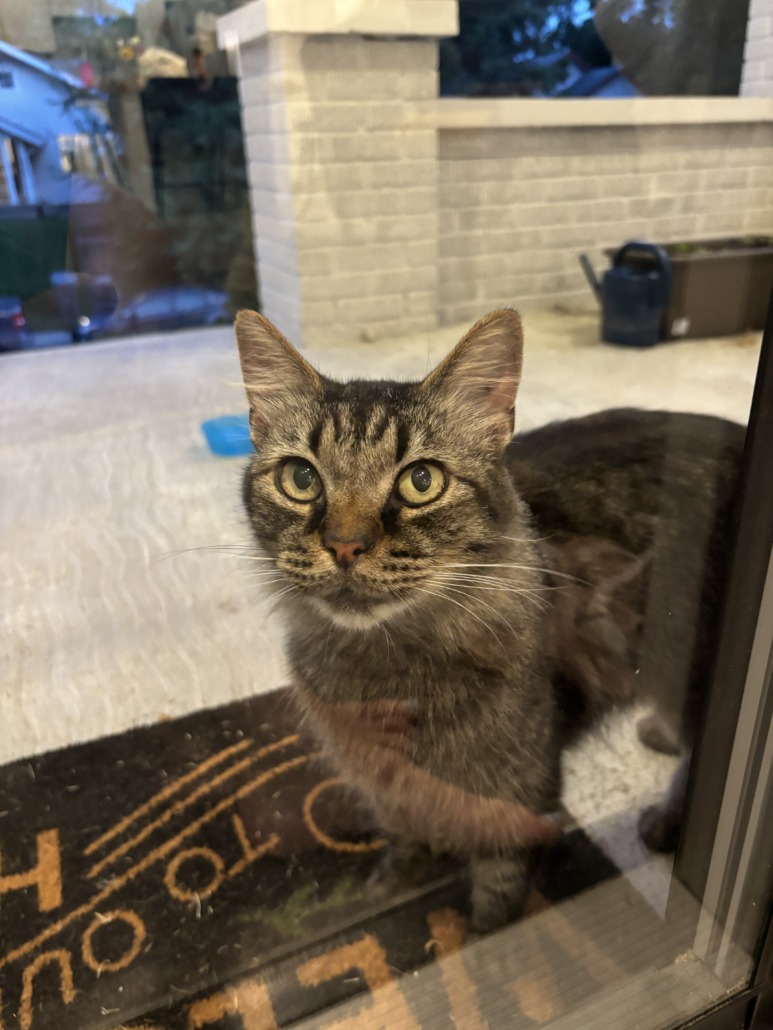 Cat came onto my porch near spades park and is acting like an indoor cat. I’m not a cat person but looks like a tabby? No collar. Fluffy tail.