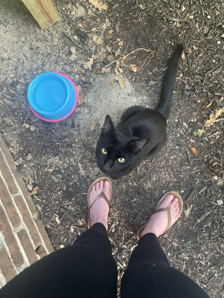 Small, black cat with gold eyes. Has all claws. Very friendly and very chatty. Proof of ownership is required.