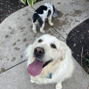 Found with her cocker spaniel buddy. Blue bandana. A little chubby. Friendly.