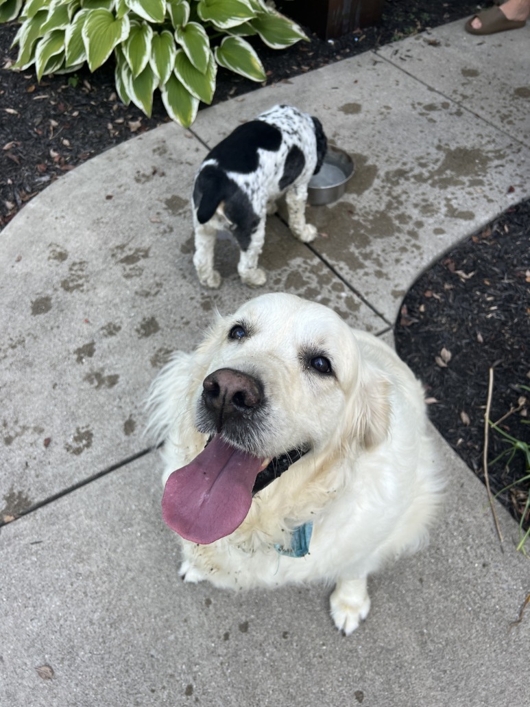 Found with her cocker spaniel buddy. Blue bandana. A little chubby. Friendly.