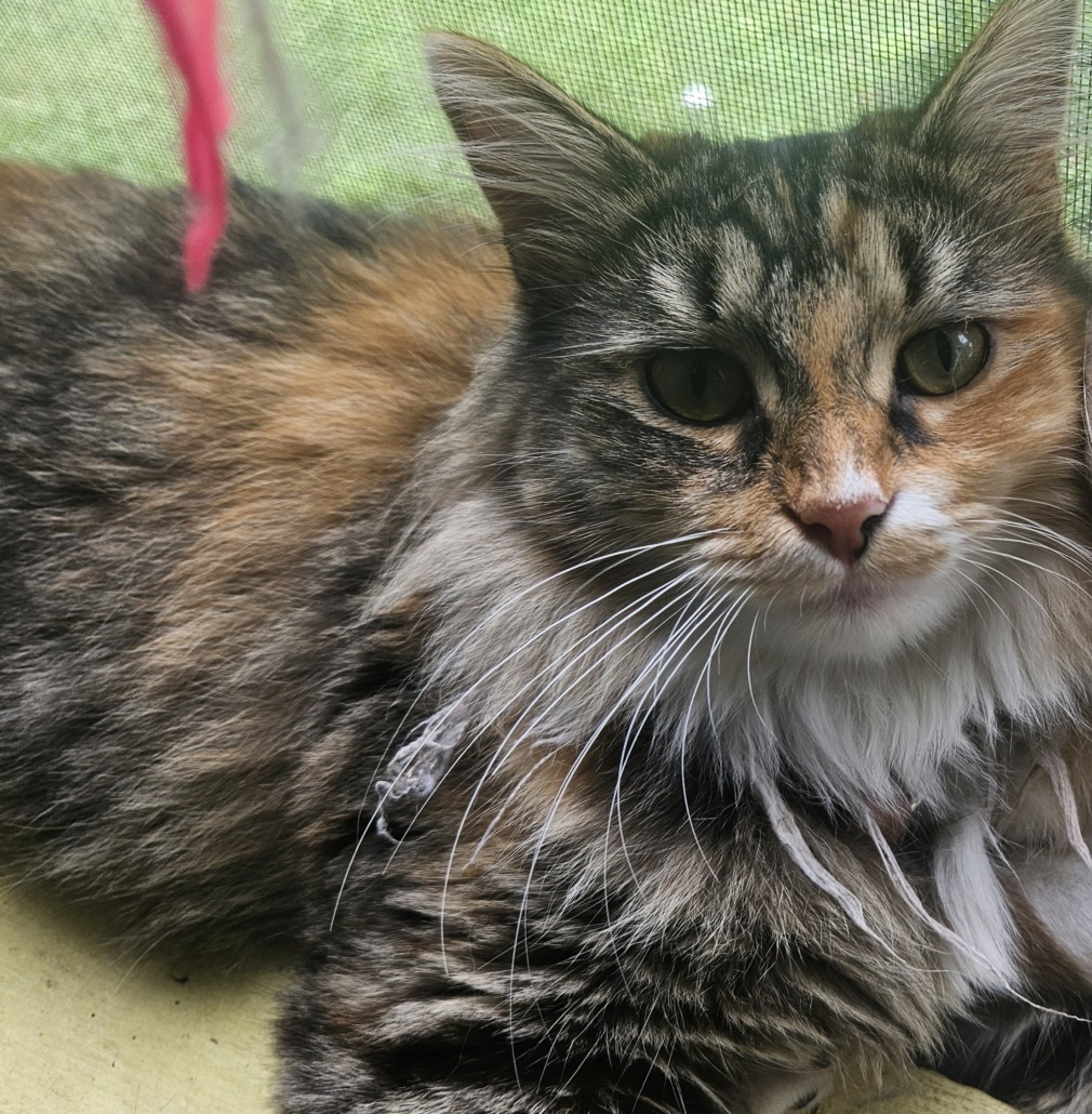 Lots or colors, has black body harness on. Very friendly but doesn’t like loud noises