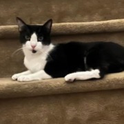 Male, black and white Tuxedo cat. Tall and slender. Very friendly.