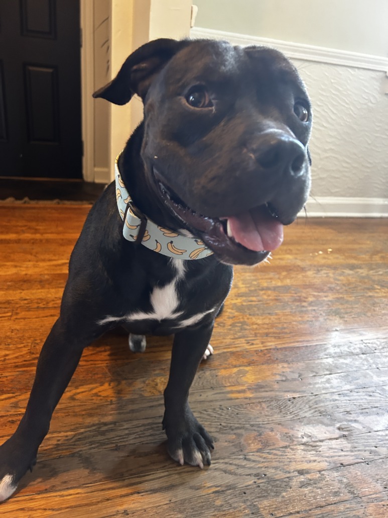 Male pit bull mix, intact, approx 1 year old, 50 lb, no collar, no microchip. Collar in photo is new. Has been running for weeks in Meridian Kessler. Proof of ownership required.