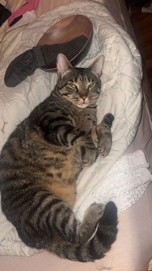 Loki looks like a classic tabby cat with stripes and an “M” on his forehead. His back and side are darker with dark gray and black but his tummy is light brown and some brown across his nose. He has really wide green eyes. He is extremely people friendly, he can be a little hesitant or easily scared but he loves pets and cuddles. He is heavy and pretty big and does NOT wear a collar. A small reward will be given, he is extremely important to me as he’s my therapy cat.