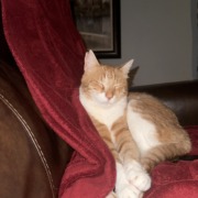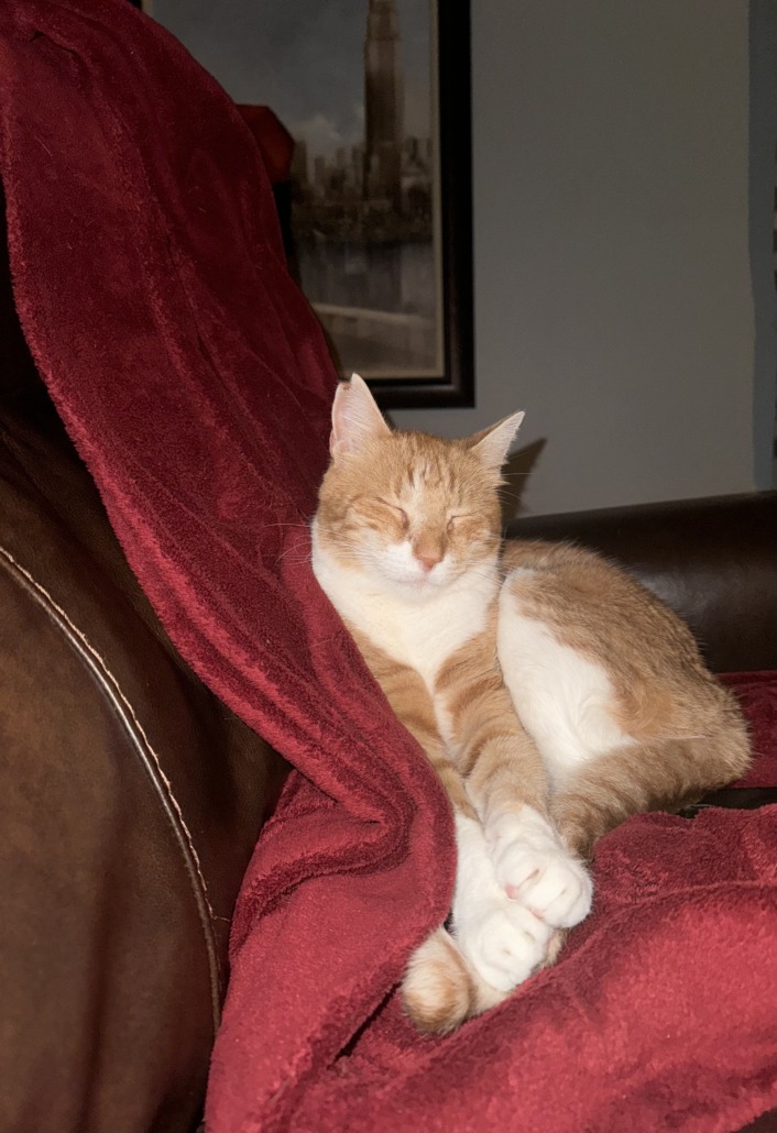 Orange tabby cat with white paws. Has an ear clipped. Very lovable but may be scared.