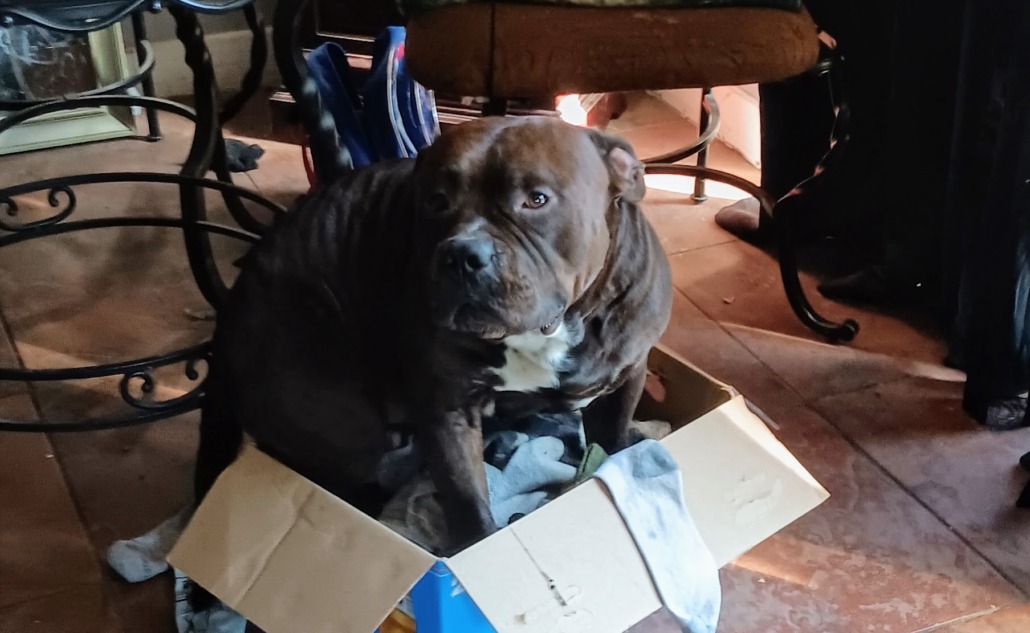 Male bully chocolate colored with white chest, friendly