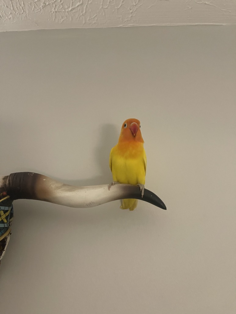 Orange and yellow lovebird, had a crooked right toe. Is afraid of hands but will fly to your shoulder. If seen, you can play lovebird sounds on YouTube to keep interested/in the area.