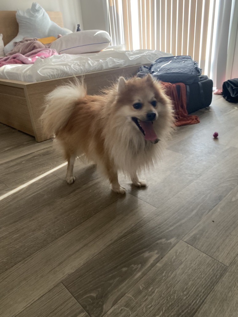 Red Pomeranian I believe to be male, very sweet. Came up to us while I was taking my dog out & then followed us home.